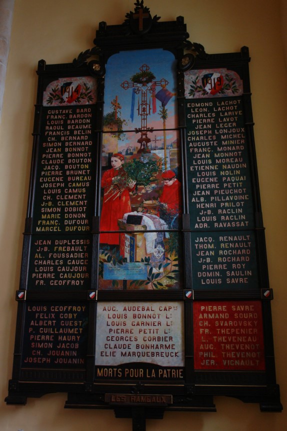 Dans le transept nord également se trouve le grand mémorial en l’honneur des soldats de 1914-1918 réalisé au début des années 1920 par Paul Renard, alors curé de Saint-Franchy. Cette œuvre a pour thème « Les Rameaux » avec cette citation de l’auteur :
