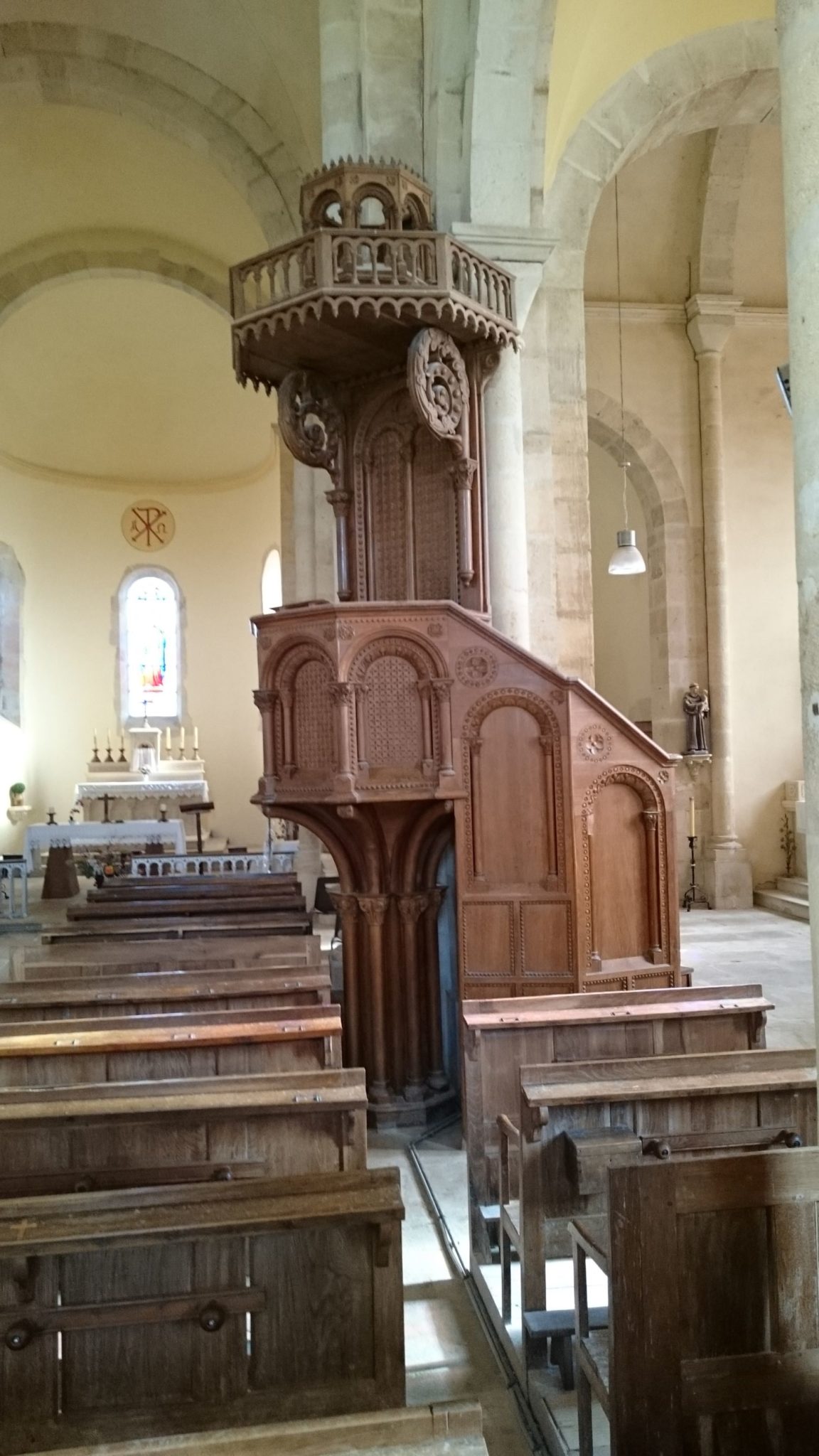 L’église de Crux contient aussi une grande chaire en bois stylisée, issue des ateliers Léon Ragueneau de Donzy (fin XIXe – début XXe).