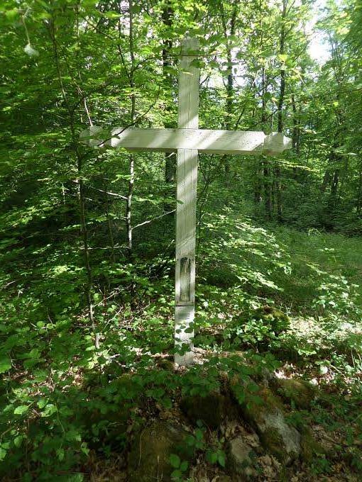 La croix Gerbault que l’on trouve en suivant le chemin au-dessus de l’ancien presbytère de Crux-le-Châtel. Là non plus on ne trouve pas trace de la date d’érection dans le livre de paroisse. Elle a été refaite et bénie au début des années 1980. A noter la petite statue de Notre-Dame de Lourdes dans la niche de cette croix. Sous la niche, une petite plaque indique « Croix Gerbault ». On ignore d’où vient ce nom.