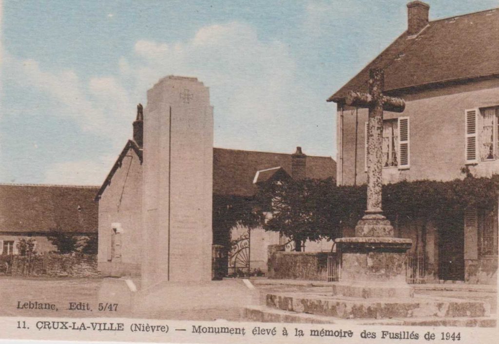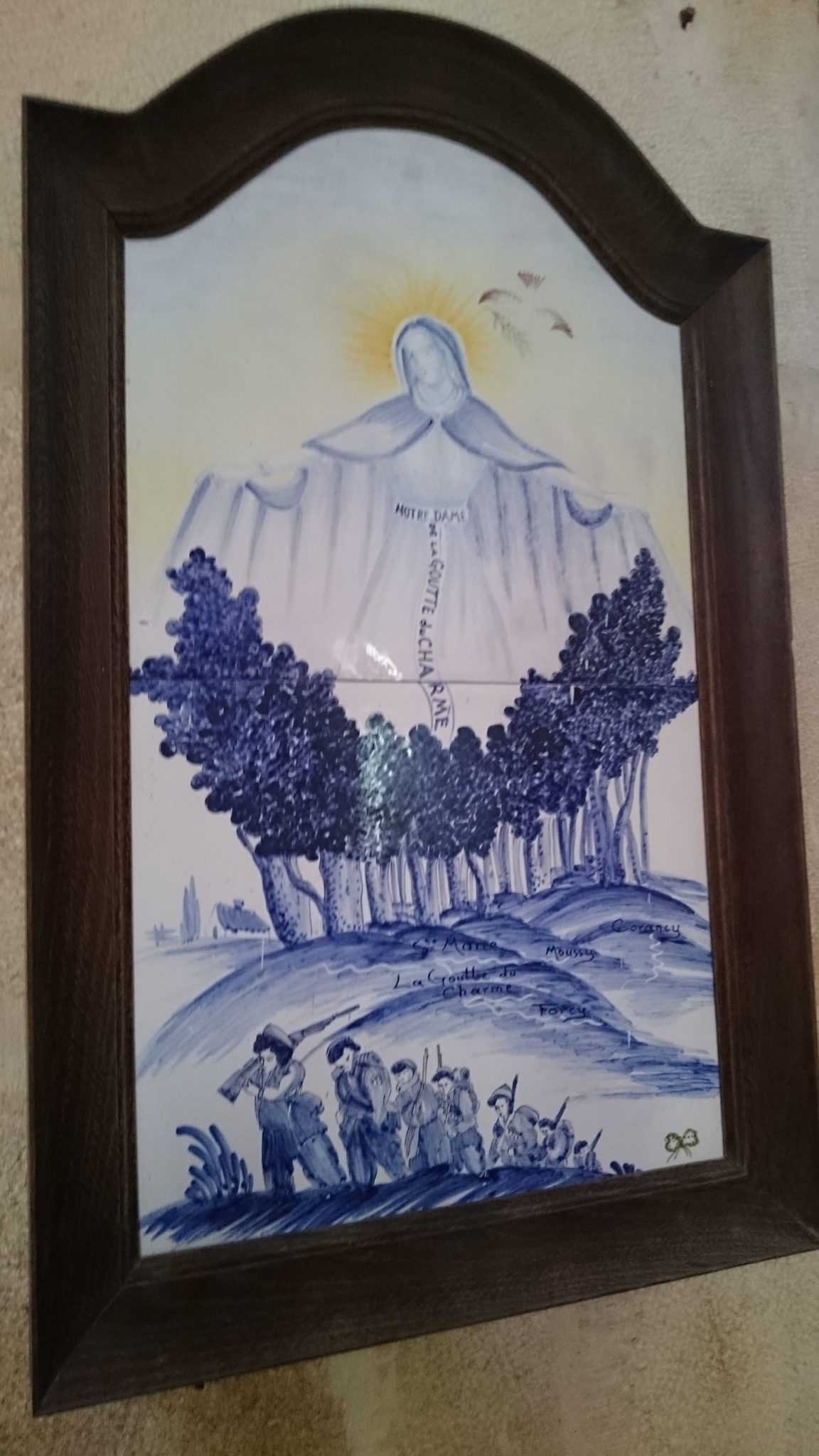 En hommage aux Résistants du Maquis Mariaux tombés lors des combats des 12-15 août 1944 dans les bois de Crux-Moussy, est accroché sur le mur gauche près de l’absidiole de la Vierge Marie, un tableau en faïence de Nevers consacré à Notre-Dame de La Goutte du Charme (l’un des lieux des affrontements). Notre-Dame avait été fortement invoquée par la population le jour de sa fête, le 15 août, pendant que des tirs incessants s’entendaient dans le bourg et autour. En remerciement à la Vierge Marie qui a évité que Crux-la-Ville ne subisse le sort d’Oradour-sur-Glane, l’épouse du commandant Gaudry a offert cet ex-voto à l’église.