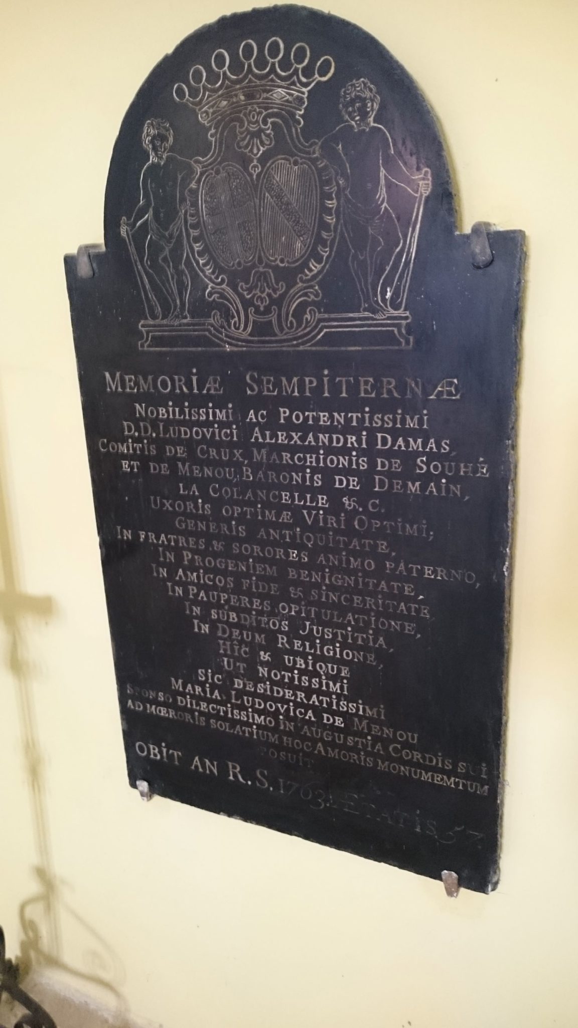 Dans le transept nord est accrochée une plaque funéraire en marbre noir aux armoiries de Louis-Alexandre de Damas (1706-1763) comte de Crux-le-Châtel (classée Monument Historique).