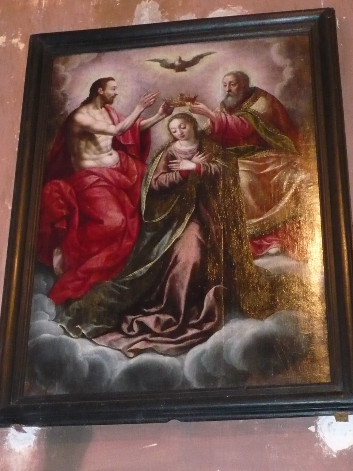 La plus ancienne est un tableau en bois peint du XVIe siècle : le Couronnement de la Vierge. Classé Monument Historique, il est accroché au mur intérieur du clocher côté nef à gauche. L’auteur reste inconnu.
