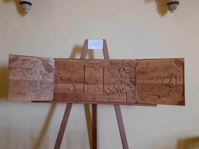 Enfin dans cette chapelle, nous pouvons voir un triptyque étonnant, en chêne sculpté, réalisé il y a quelques années par Jean-Michel Zonzon en reconnaissance à Notre-Dame de Frasnay. Y figurent plusieurs symboles : l’origine de l’homme, les signes du zodiaque, saint Christophe, une vigne, les animaux de la création, l’église de Frasnay et, bien sûr, la statue de Notre-Dame de Pitié.
