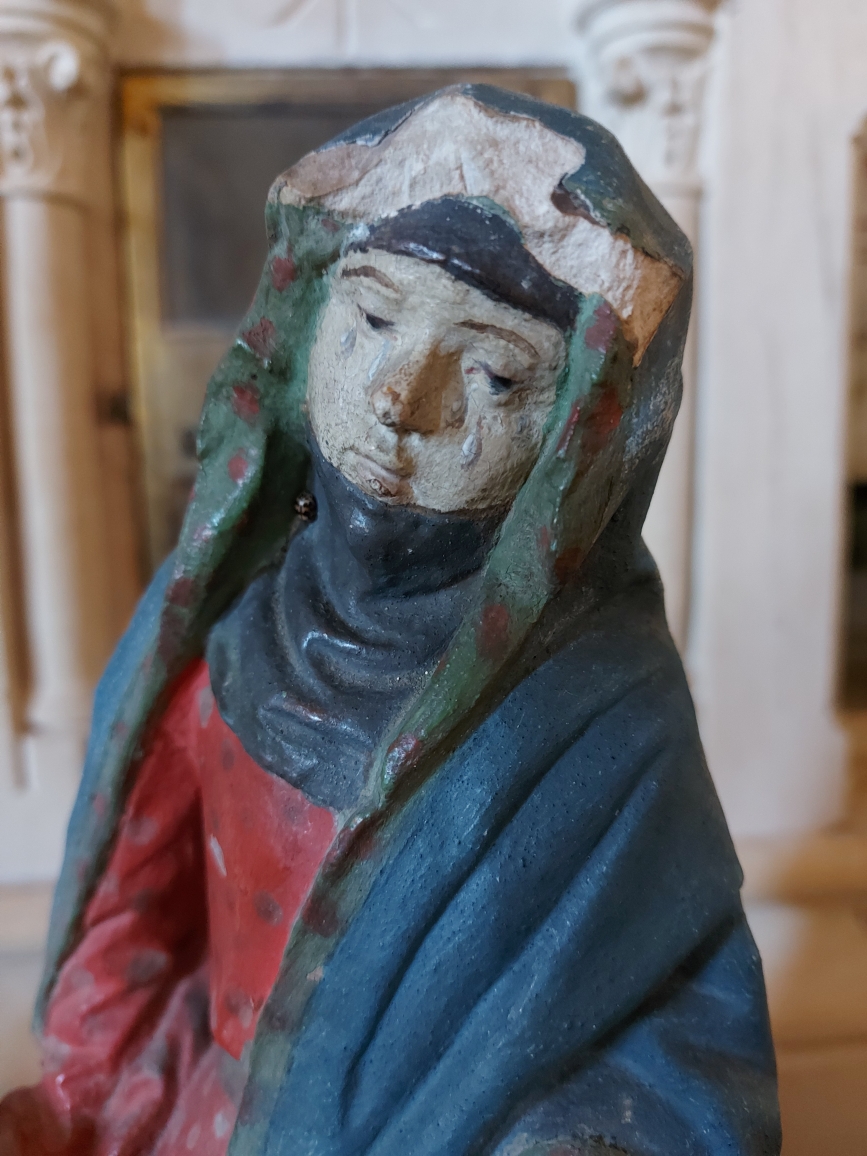 Comme pour toutes les Pietà, la place centrale est donnée à Marie. Son fils, détaché de la croix, étendu sur ses genoux, semble beaucoup plus petit qu’elle. Il faut regarder le visage de cette mère en larmes et se laisser toucher par son expression de profonde tristesse.